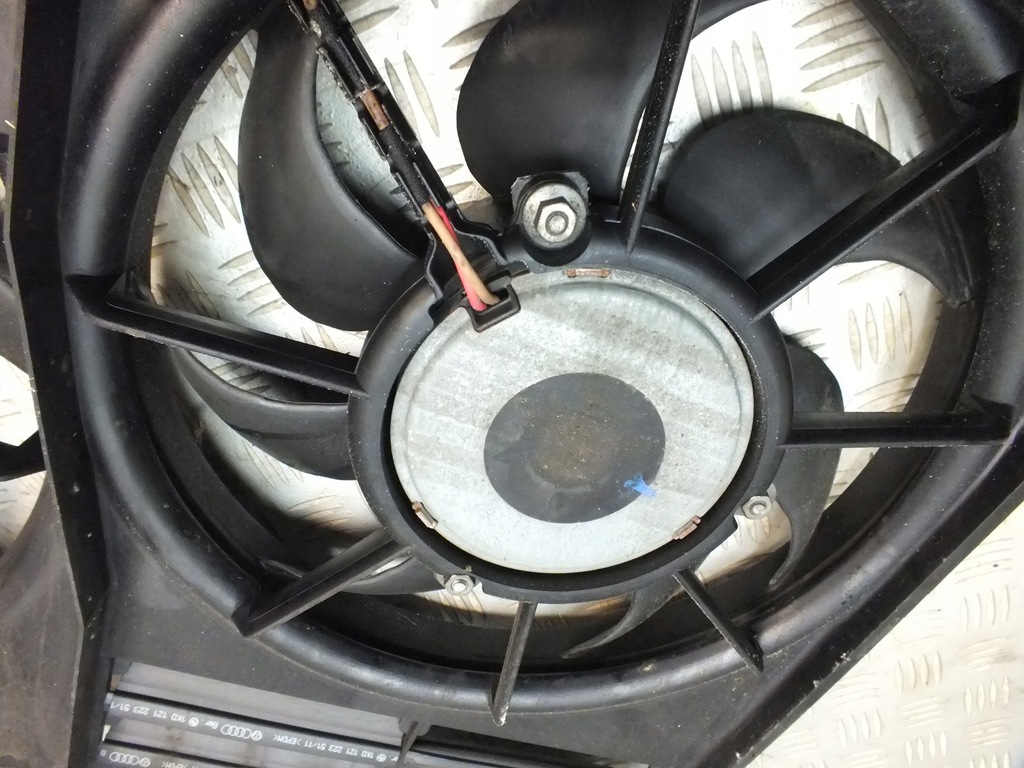 Carcasa del ventilador del radiador completa, el ventilador más pequeño tiene dos aspas dañadas.