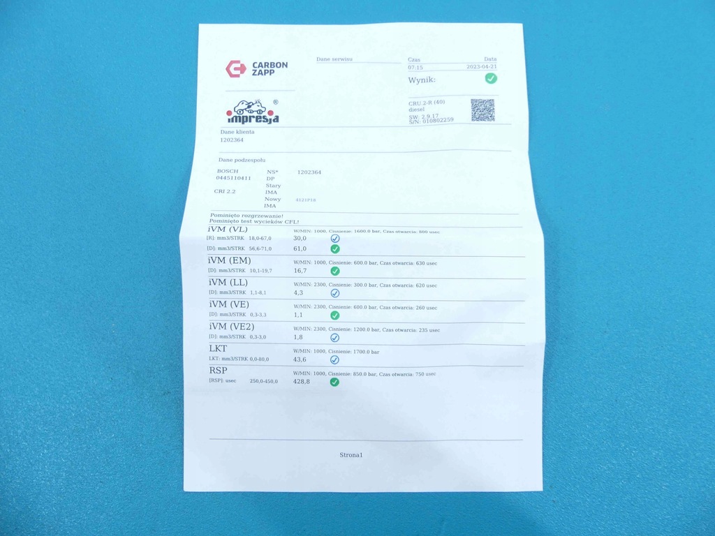 Marca Modelo: Hyundai I40 Número de VIN del vehículo: KMHLC81UACU038207 Año de producción. vehículo 2012. Descripción del vehículo: 1.7 CRDI 116KM familiar Caja de cambios manual 5D climatizador versión europea Información adicional: Limpiado y probado en el dispositivo Carbon Zapp CRU.2R con código IMA,