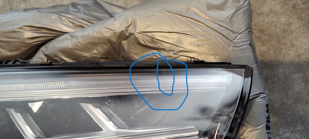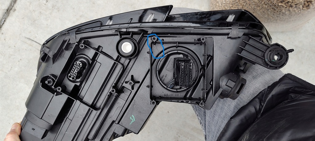 IL A UNE OREILLE, VOUS POUVEZ LA VOIR SUR LA PHOTO, ELLE EST CASSÉE POUR RÉPARATION INDIVIDUELLE - L'OREILLE INFÉRIEURE CASSÉE SOUS LA LAMPE N'EST PAS VISIBLE APRÈS LE MONTAGE DE LA LAMPE SUR LA VOITURE et la fissure où le convertisseur doit être soudé - également marquée en bleu