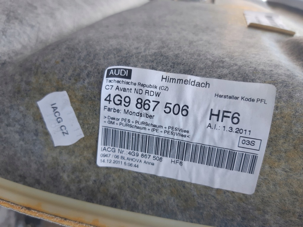 Je vends une garniture de toit d'une voiture Audi A6 C7 AVANT/KOMBI, couleur MONDSILBER.