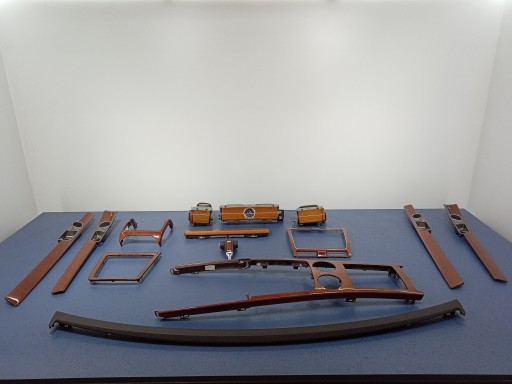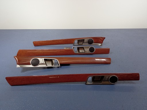 Description : ensemble de décors du tableau de bord, de la console centrale, des panneaux de portes, des bouches d'aération, bois d'eucalyptus, de traces d'utilisation visibles, éclats, porte-gobelets manquants du tunnel central et décors du mont-blanc, bouche d'aération centrale endommagée, - qualité B && PHAETON LIFT 07 - ENSEMBLE DE DÉCORS INTÉRIEURS EUKALIPTUS